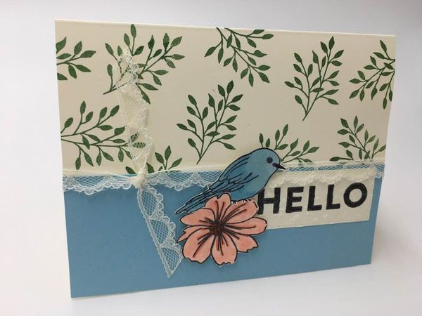 Stampin' Blends were used to color the flower and bird. I used the Vanilla Scalloped Lace Trim. On the pc. with the "Hello", I used the brand new embossing folder called Stripes & Splatters AFTER I stamped of course.